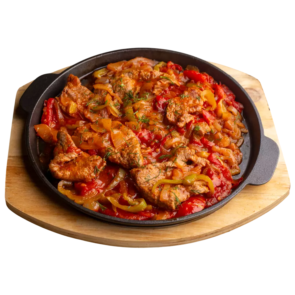 Состав: говяжье контр-филе, лук, болгарский перец, помидор.