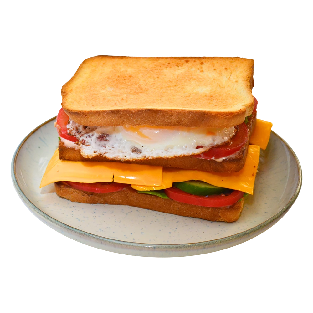 Состав: тостовый хлеб, соус, салат лист, помидоры, огурцы, сыр, куриное филе, яйцо