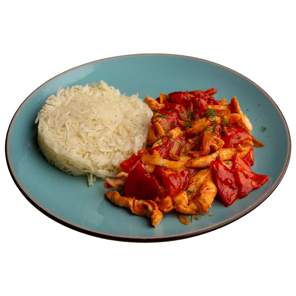 Состав: куриная грудка, лук, помидоры, болгарский перец, соевый соус, специи.