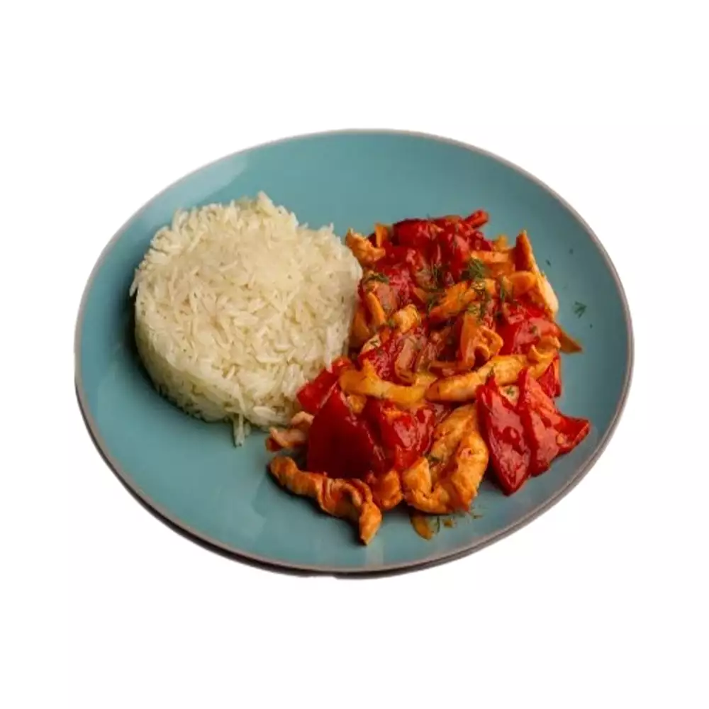Состав: куриная грудка, лук, помидоры, болгарский перец, соевый соус, специи
