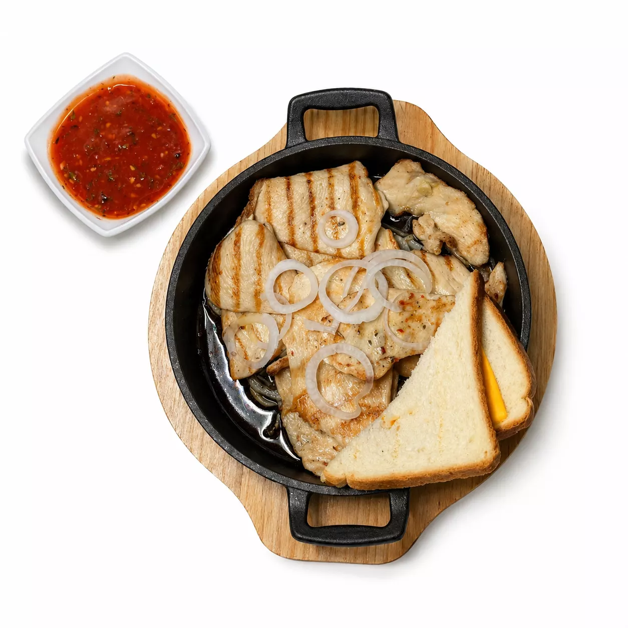 Состав: куриная грудка, сыр, тост хлеб, помидоры, кетчуп, пулбибер, зелень, чеснок, масло сливочное