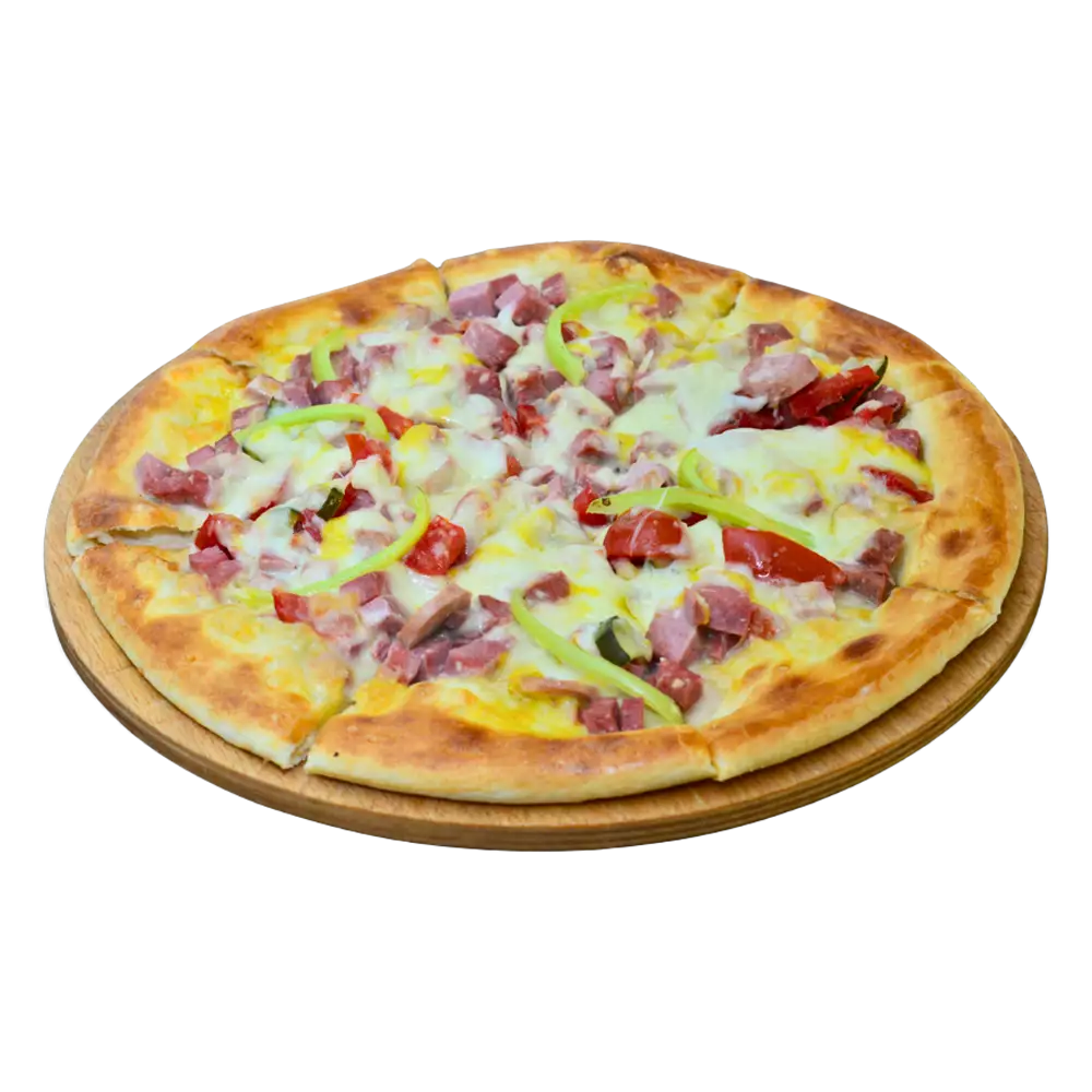 Колбаса, сосиски, грибы, сыр, болгарский перец, помидоры, соус.