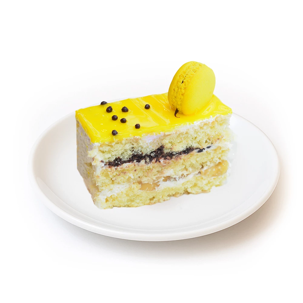 Состав: белый бисквит, сливочный крем, банан, шоколадная паста, шоколадные дропсы, фруктовая глазурь.