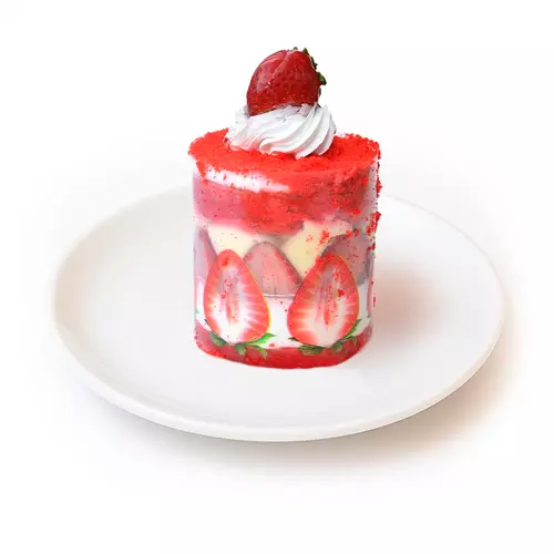 Состав: красный клубничный бисквит, чиз-крем и клубника.