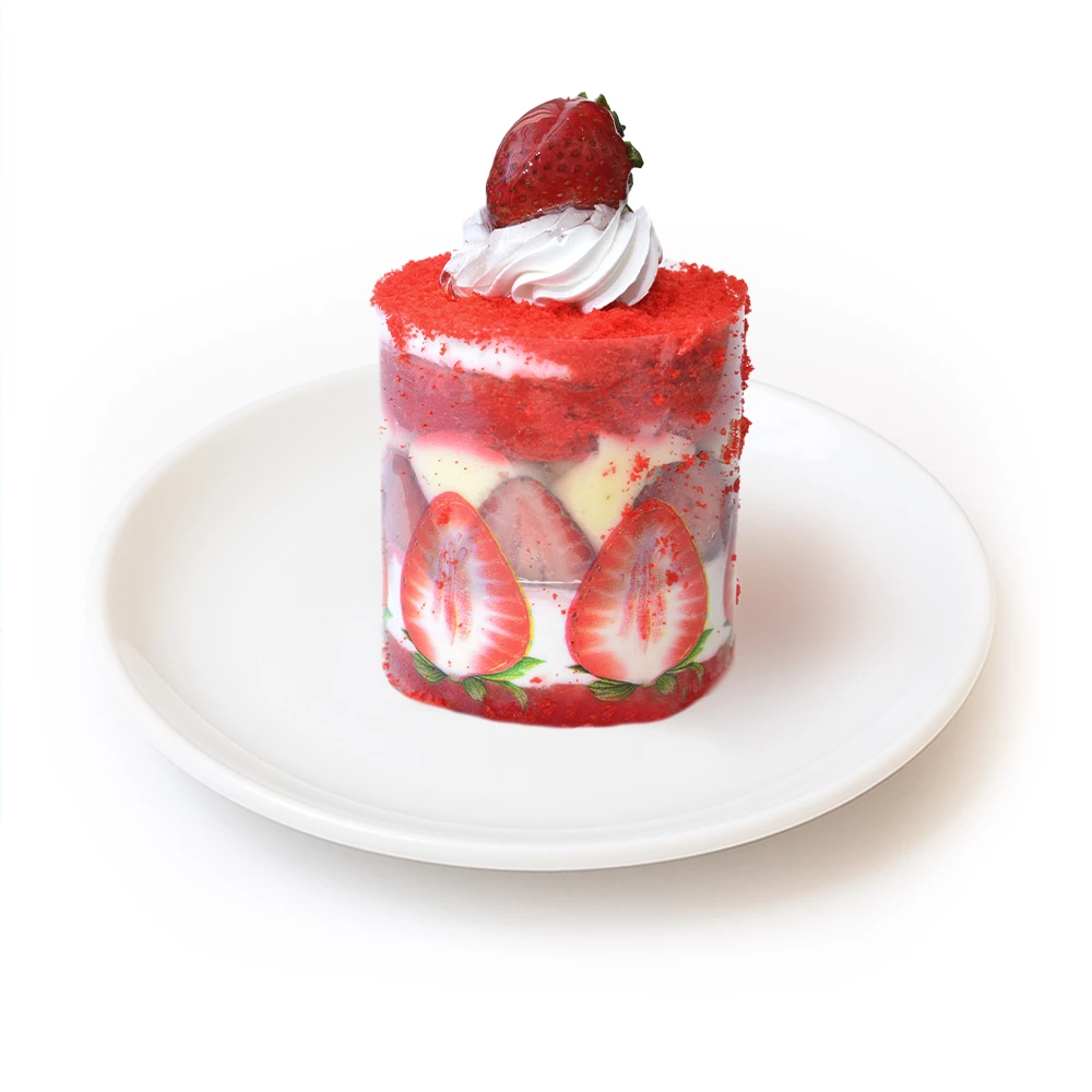 Состав: красный клубничный бисквит, чиз-крем и клубника.