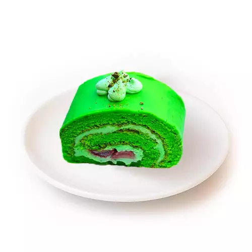 Состав: Бисквитный фисташковый рулет с клубникой и сливочным кремом.