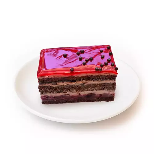 Состав: белый бисквит, сливочный крем, вишневый джем, ягодная глазурь.