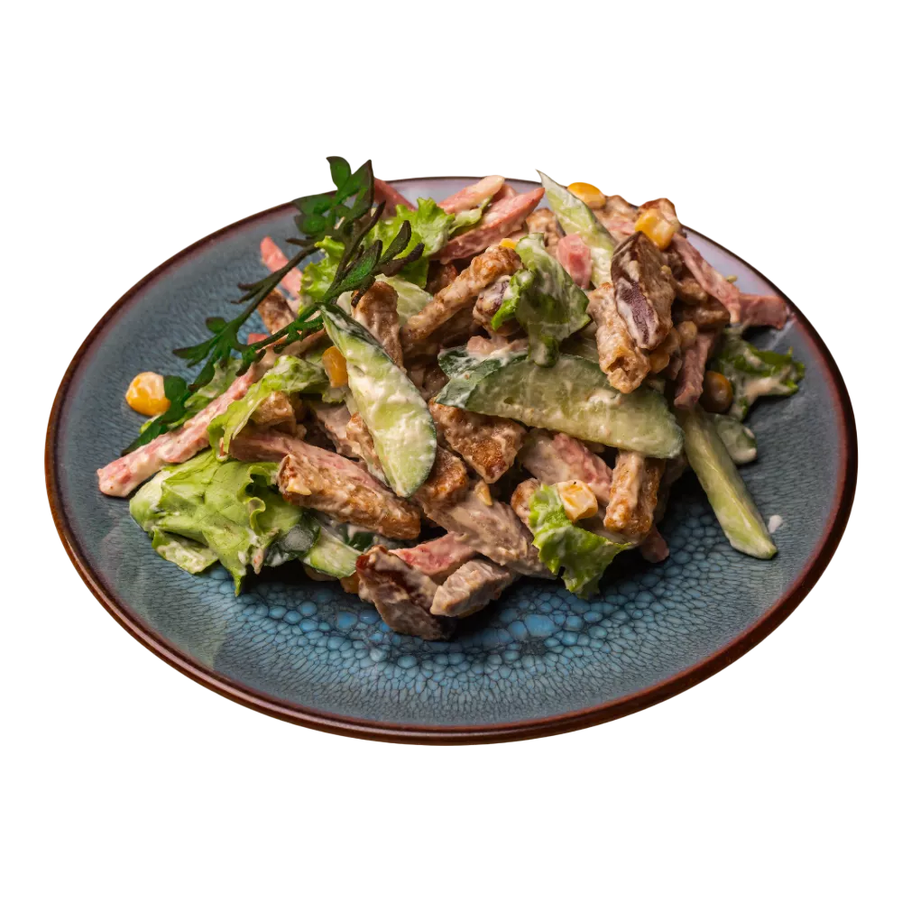 Состав: огурцы свежие, сухари, колбаса полукопченая, говядина запеченая, кукуруза, майонез.