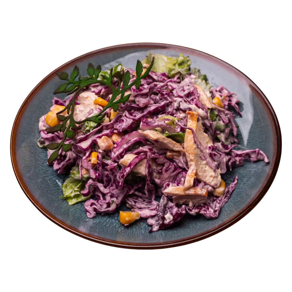 Состав: капуста красная, куриная грудка запеченная, кукуруза, лист салата, майонез