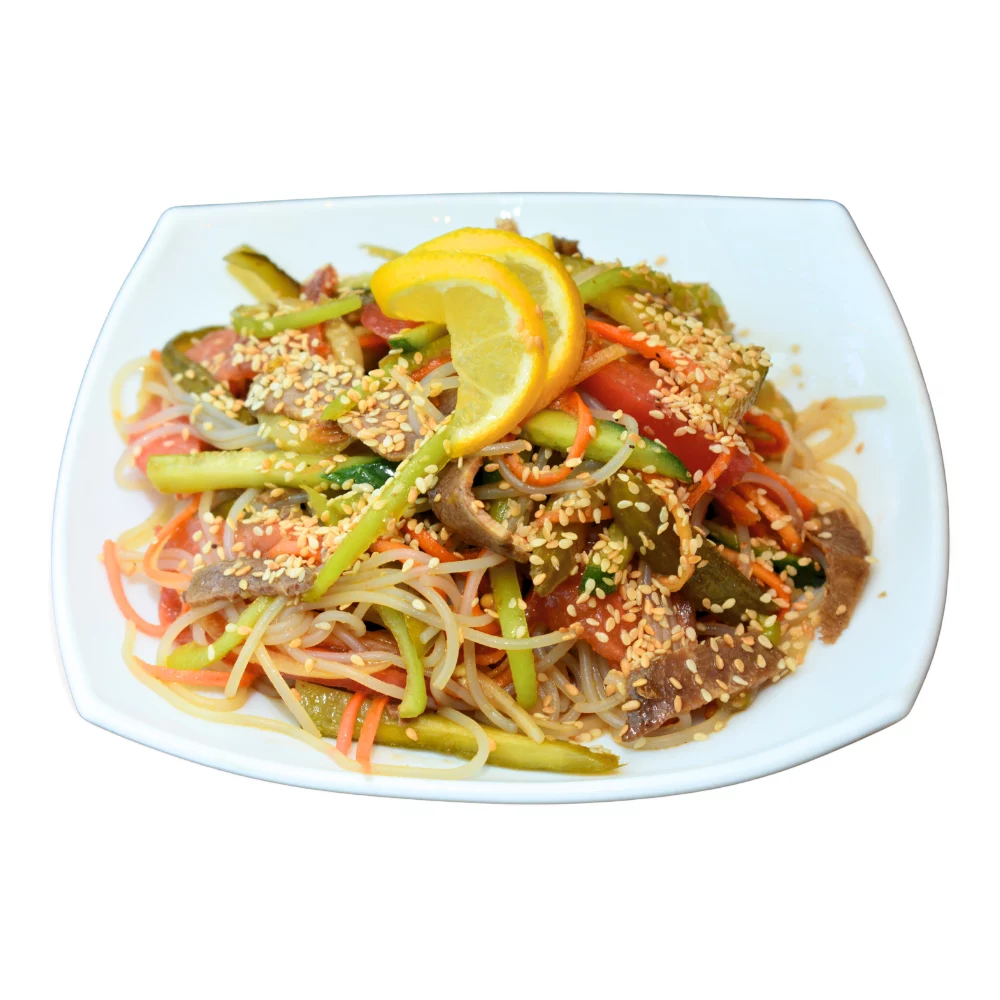 Состав: говядина ростбиф, фунчоза, огурцы, помидоры, морковь, болгарский перец, лук, кунжут, соевый соус, лимон