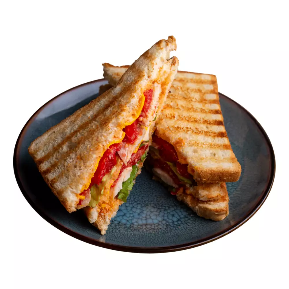 Состав: хлеб для тоста, куриная грудка, сыр, помидоры, лист салата, майонез