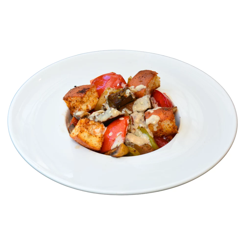 Состав: телятина, болгарский перец, помидоры, грибы, лук, зелень, сухари, черный перец, пул бибер, соусы