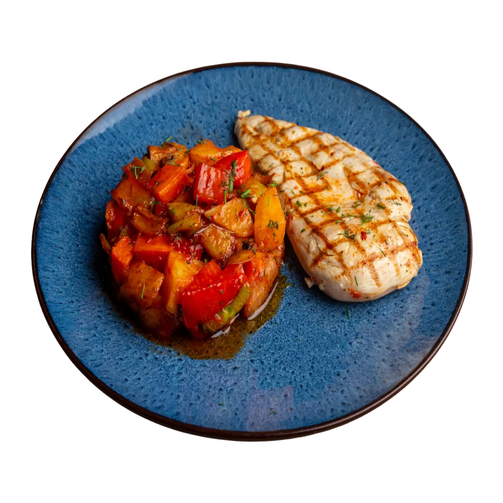 Towuk döşi, sogan, bulgar, pomidor, ýer alma, käşir, kömelek.