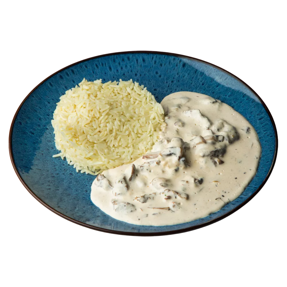 Ak sously et - bu sygyr eti bilen şampinýon kömelekleri goýy we kremly sousda ajaýyp sazlaşýarlar.
