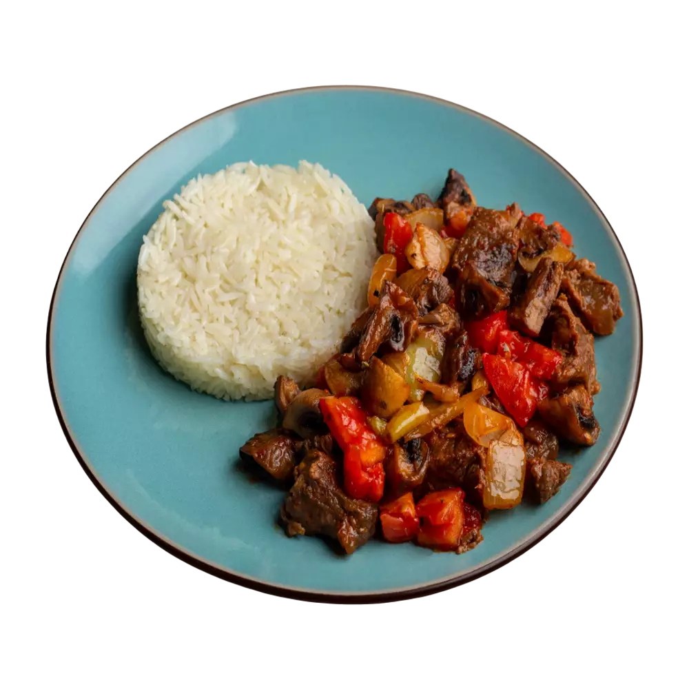 Sygyr eti, kömelek, sogan, pomidor, soýa sousy.