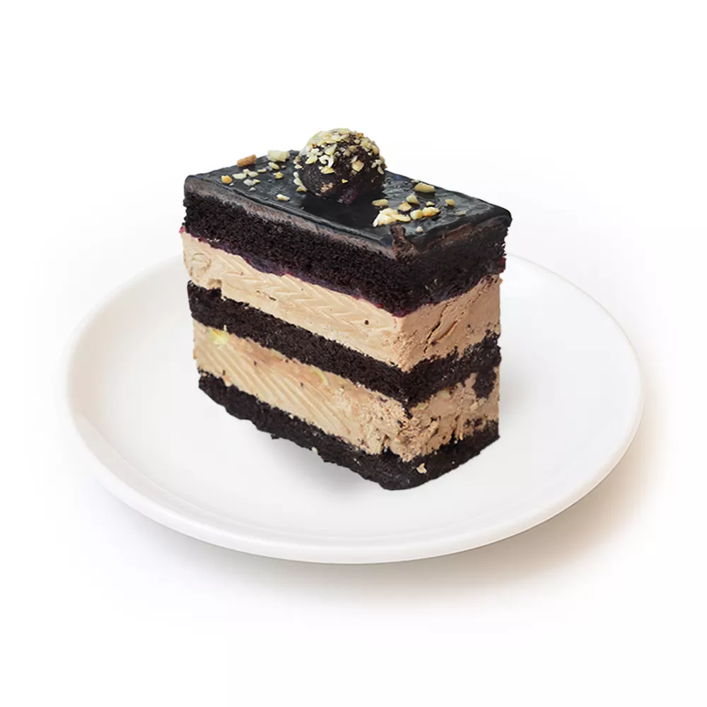 Düzümi: şokoladly biskwit, süýtli ganaş, funduk, malina mürepbesi, şokoladly glazur