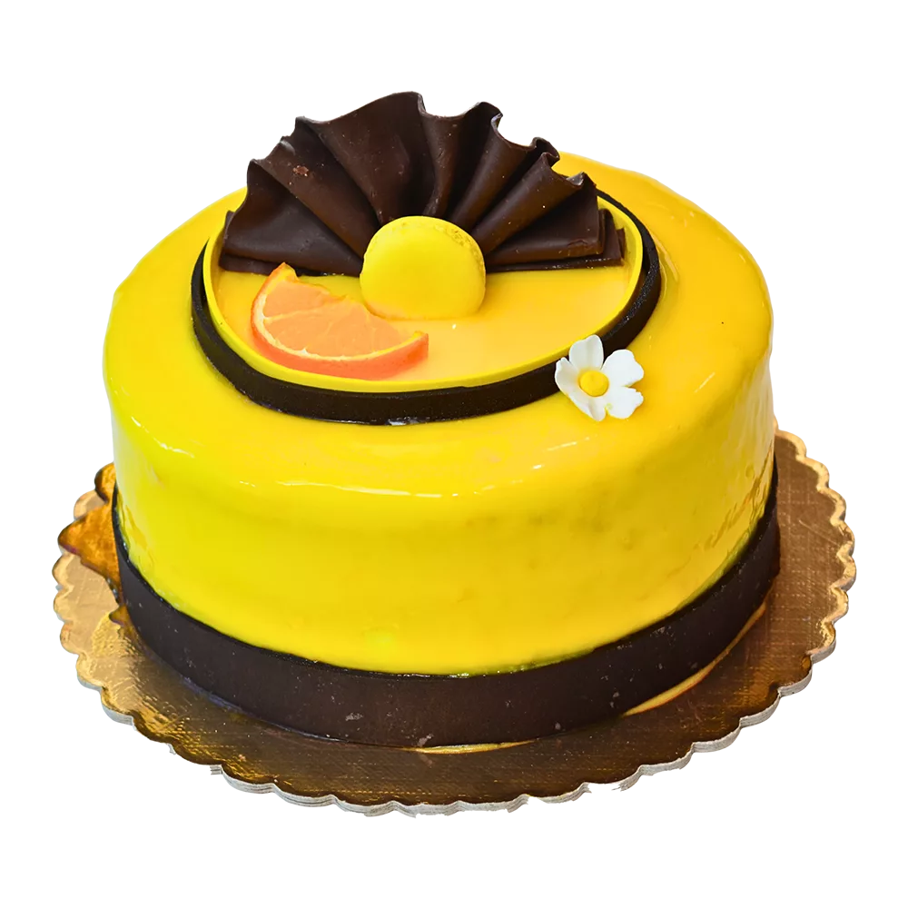Состав: белый бисквит, крем белый, шоколадный крем, апельсиновый курд с маслом