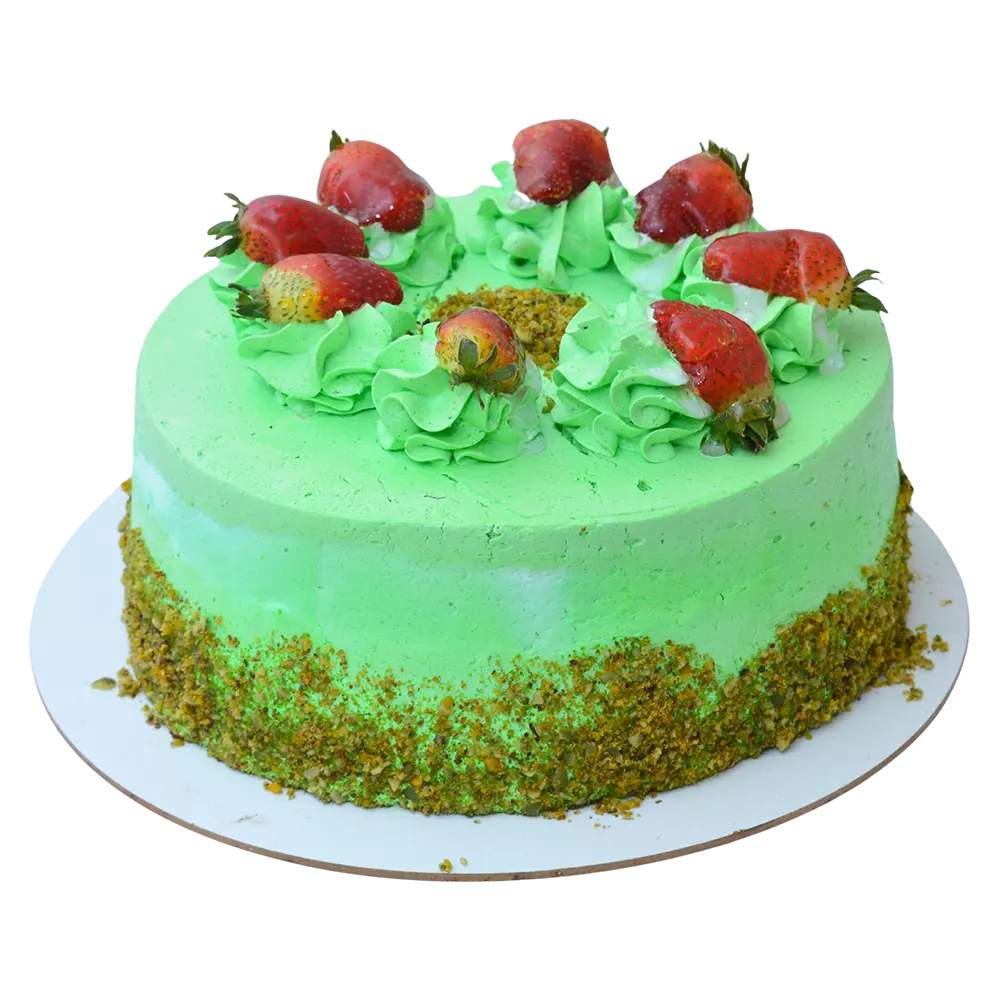 Состав: маслянный бисквит, зеленый краситель, фисташки, крем чиз, клубничное варенье