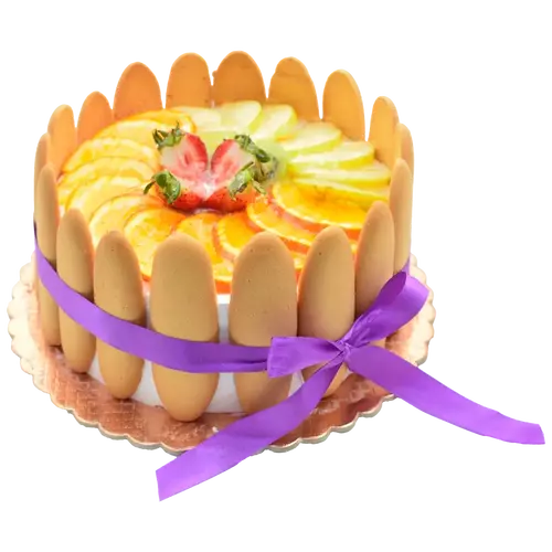 Состав: белый бисквит, чиз-крем, фрукты ассорти (по сезону), песочное печенье.