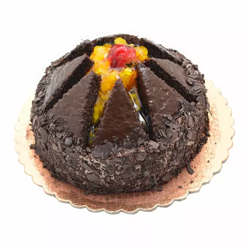 Состав: шоколадный бисквит, сливочный крем, фрукты ассорти (по сезону), шоколадная крошка.