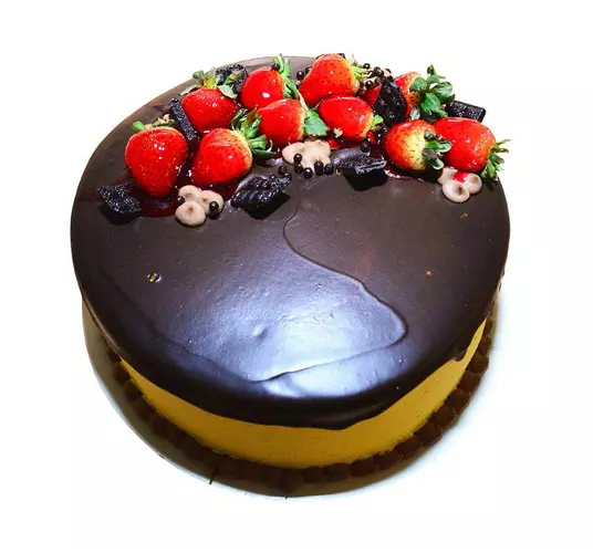 Состав: шоколадный бисквит, шоколадный сливочный крем, клубничный джем, шоколадная глазурь, клубника.