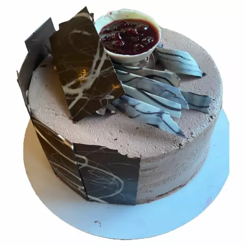 Состав: Ганаш шоколадный, вишневый джем, ванилин, шифоновый бисквит, шоколадная плитка, клубника, желе