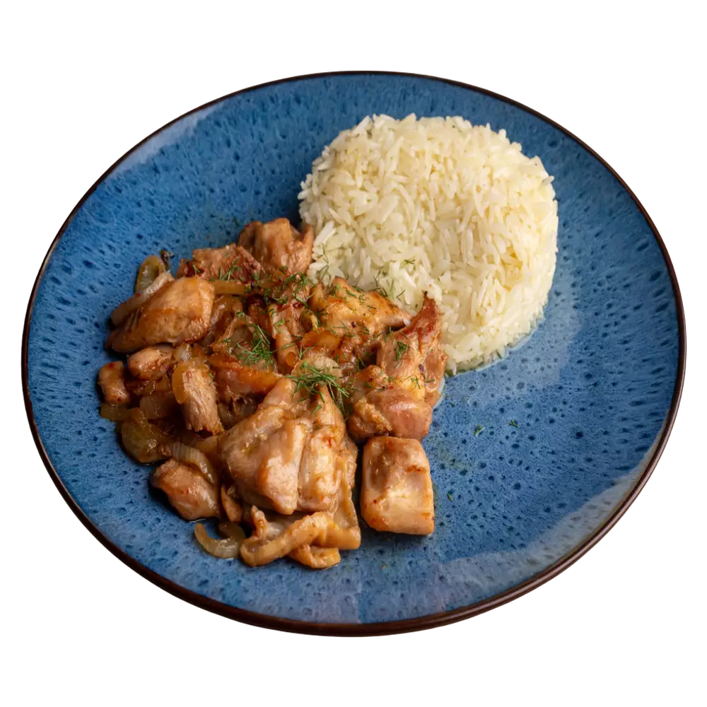 Состав: куриное филе, рис, лук, чеснок, соевый соус, специи.